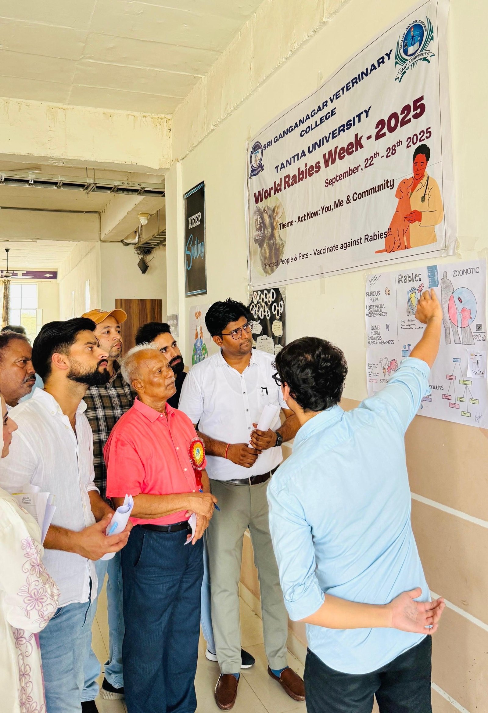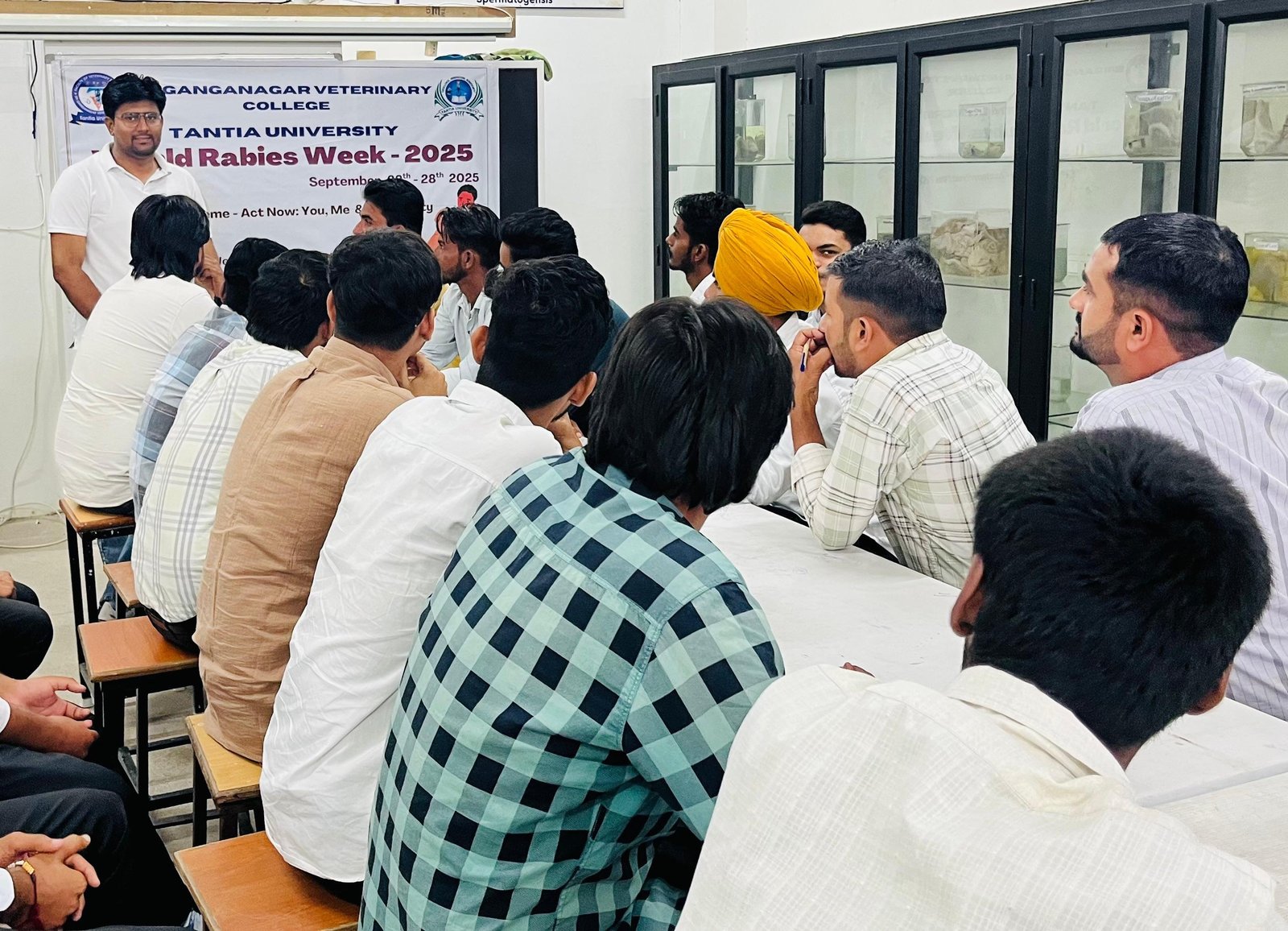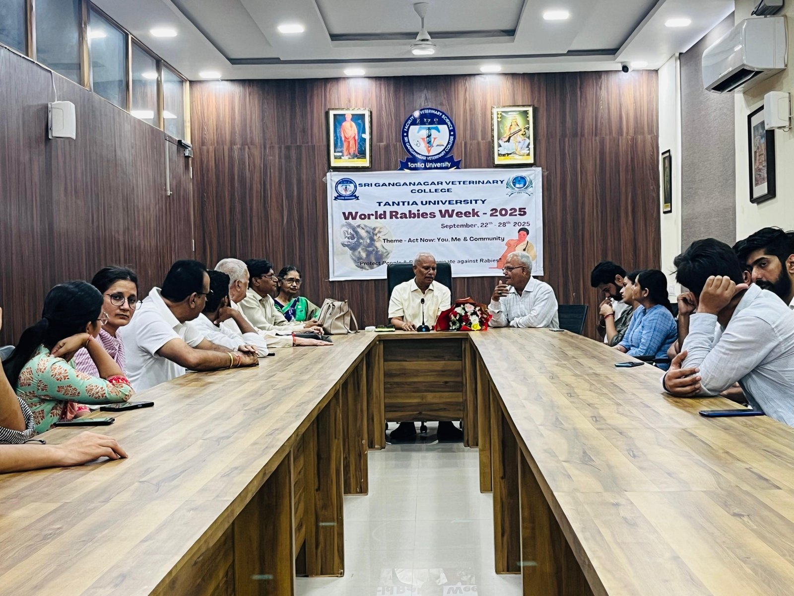 The Faculty of Veterinary Science, Tantia University, Sri Ganganagar, organized World Rabies Week from 22nd to 28th September 2025 under the global theme "Act Now: You, Me, Community." The week-long programme was aimed at creating awareness about rabies, promoting preventive measures, and sensitizing students, staff, and the community about their role in rabies eradication.